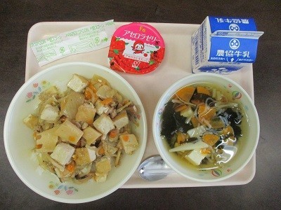 今日の献立は、ごはん、厚揚げのみそ炒め丼の具、かまぼことわかめのすまし汁、アセロラゼリー、牛乳でした。厚揚げのみそ炒め丼は、厚揚げとみそ味がよく合っていて、とってもおいしかったです。栄養満点でスタミナがつきました。