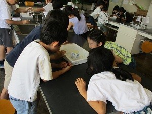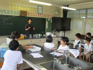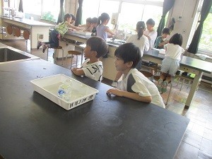 今日の5時間目に、2年生が理科室で算数「水のかさ」の学習をしていました。1dLますを使って、給食の牛乳パックや水筒などに入る水のかさを調べていました。「へぇー、給食の牛乳は1dLます2杯分だ。思っていたのより少ないな。」と、子どもたちは身の回りの様々な物を計量することで、かさの量感をつかんでいました。