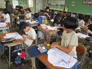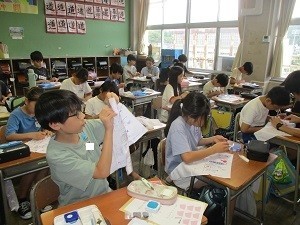5年生が、家庭科の学習でソーイングに取り組んでいました。糸通し、玉結び、玉留めなどの基本を学習し、練習布に自分の名前を縫っていました。細かい作業になりますが、子どもたちはとても集中して取り組んでいました。