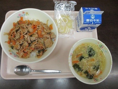 今日の献立は、豚キムチ丼、たまご入り中華風コーンスープ、牛乳、冷凍パインでした。豚キムチ丼は、キムチのピリッとした辛さや、もやしのシャキシャキの食感がおいしく、ごはんがすすみました。デザートの冷凍パインもおいしかったです。