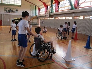 5年生は、総合の学習で福祉をテーマに学んでいます。今日は、新潟県介護福祉会様より出前講座をしていただきました。介護の仕事についての講義を受けた後、高齢者類似体験と車椅子体験をしました。高齢者疑似体験では、重りの入ったベストやアイマスク、ヘッドフォンなどを着用して階段を歩行しました。付き添うペアの子が、手をつないで優しくサポートしていました。実際に体験することで、福祉に対する理解を深めることができたようです。新潟県介護福祉会の皆様、本日は大変ありがとうございました。