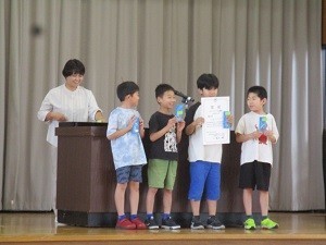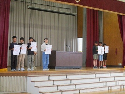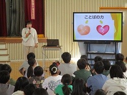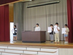 今日は10月の全校朝会がありました。前半の校長講話では、北原白秋の「ひとつのことば」という詩を紹介し、言葉の力について考えました。どんな言葉が人を傷つけたり、悲しくさせたりするのか、また、どんな言葉が人を笑顔にしたり、勇気づけたりするのかをしっかりと考えて、自分の言葉を大切につかってほしいことを子どもたちに伝えました。後半では、先日行われた科学研究発表会や親善陸上大会、スポーツ大会(バレーボール)の表彰伝達を行いました。すばらしい頑張り、活躍に全校のみんなで大きな拍手を送りました。