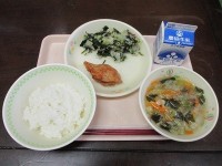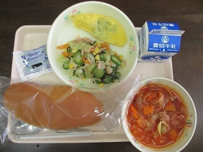 今日の献立は、コッペパン、ブルーベリージャム、ほうれんそうオムレツ、りっちゃんサラダ、牛乳でした。りっちゃんサラダとは、1年生の国語の教科書に載っている「サラダでげんき」というお話に出てくるサラダのことです。「サラダでげんき」の学習をしている1年生はもちろんのこと、他の学年の子どもたちも、お話を思い出しながら味わって食べていました。