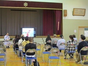 本日、新1年生となる年長児の皆さんが、内科・歯科検診他、様々な健診を受けに学校へ来ました。その間、保護者の皆様は、体育館で青柳学校歯科医様からフッ化物洗口や虫歯予防についてのお話を聞きました。