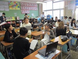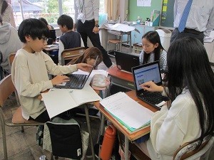 今日の5時間目に、5年生 理科の授業を職員で参観し、研修を行いました。授業では、「雲と天気の変化」の単元のまとめとして、雲画像や降雨情報などの気象情報を基に、明日の加茂市の天気をグループで予想する活動をしました。子どもたちは、タブレットを用いて気象情報サイト等から必要な情報を選択、収集し、「雲は西から東へ移動しているから、明日はこの雲が加茂市にかかりそうだね」と、理由を明確にしながら天気を予測していました。