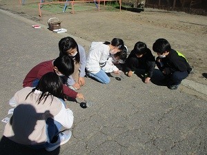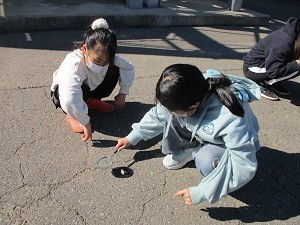 今日は、久しぶりの快晴の天気でした。貴重な秋の晴れ間を使って、3年生が校庭で虫めがねを使った実験をしていました。虫めがねで日光を集め、光を黒画用紙に当てたときの様子を調べていました。「わっ、煙が出た!」「紙がこげたよ。すごい!」と、子どもたちは、虫めがねで集めた日光のパワーのすごさに大変驚いていました。