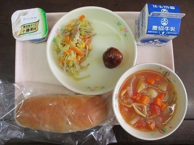 今日の献立は、アップルチップパン、ミートボール、キャベツのソテー、ミネストローネ、ヨーグルト、牛乳でした。アップルチップパンには、甘いアップルチップがたくさん入っていて、おいしかったです。ミネストローネには、貝殻の形のマカロニが入っていました。ほどよいトマトの酸味で、パンともよく合っていました。