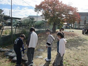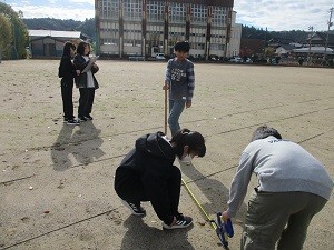 算数で比の学習をしている6年生。等しい比の性質を利用して、かげの長さを基に、校庭にある桜の木の高さを求めることに挑戦しました。「1mものさしのかげの長さは約1.6mだから、1:1.6だね」「桜の木のかげは、約12mだから・・・」「じゃあ、式は・・計算は・・」と、グループのメンバーで協力し合いながら、木の高さを求めていました。比を活用することのよさを実感できた学習となりました。