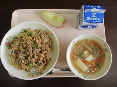 今日の献立は、しゃきしゃきたまごそぼろ丼、あさりのみそ汁、牛乳、りんごでした。そぼろ丼には、きりぼし大根が入っていました。そぼろともよく合っており、ごはんがすすみました。みそ汁には、あさりがたくさん入っており、出汁がよくきいていました。