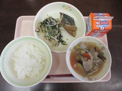 今日の給食は月1回の食育献立でした。献立は、ごはん、さばのカレー煮、のり酢和え、さつま汁、牛乳でした。さばのカレー煮は、カレーの風味が食欲をそそりました。さつま汁は、甘みのあるサツマイモやごぼう、鶏肉など様々な具材が入っており、栄養満点でした。のり酢和えもさっぱりとしていて、おいしかったです。