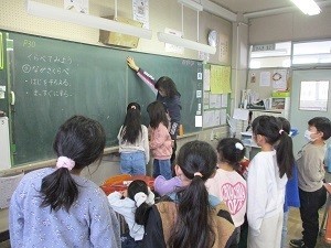1年生が算数で「長さくらべ」の学習をしていました。黒板の前に集まり、2本の毛糸の長さの比べ方について、みんなで考えていました。「きちんと端をそろえる」「毛糸をぴんと伸ばす」「毛糸が斜めになっていてはダメ。2本をまっすぐに置くよ」と、子どもたちはたくさん発言をしていました。