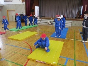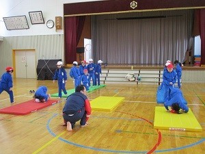 2年生が体育の学習でマット運動に取り組んでいました。今日の授業では、ゆりかご、カエルの足打ち、前転などの技に挑戦しました。子どもたちは、前転の練習では、「頭の後ろの方をマットにつけるようにすること」「回転した後は、両手を前に出すこと」などのポイントに気を付けて、くるんと上手に回っていました。