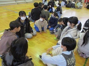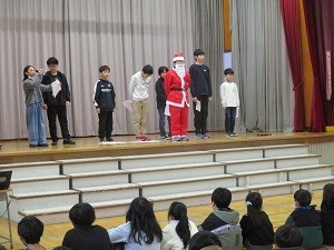 今朝は児童朝会がありました。保健環境委員会による風邪予防についての○×クイズに、フレンド班で挑戦しました。ゲストにサンタクロースさんも登場し、楽しい雰囲気の中で、風邪予防のポイントをみんなで確認しました。丁寧な手洗い、十分な睡眠、部屋の換気等に気を付けて、元気に過ごしていきましょう。