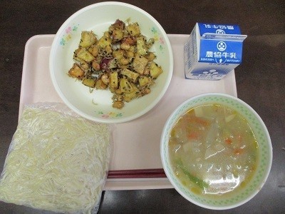 今日の献立は、うずら入り長崎ちゃんぽん風(ソフト麺)、かわり大学芋、牛乳でした。長崎ちゃんぽん風は、スープにコクがあり、具材も豊富でとってもおいしかったです。かわり大学芋には、さつまいもの他にちりめんじゃこと大豆も入っていました。子どもたちにも人気でした。