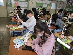 6年生が図工の学習で、題材「未来のわたし」の作品づくりに取り組んでいます。未来の自分の姿(将来の夢やなりたい姿)を想像し、紙粘土で立体に表していきます。子どもたちは、人型の心材を使って動きのあるポーズをつくり、「もう少し、頭は丸くした方がいいかな」と心材に粘土をつけて、自分の姿が立体的になるようにつくっていました。どんな「未来のわたし」が完成するのか楽しみです。