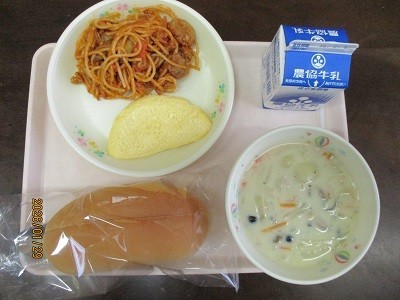 今日の給食は「持久力アップ献立」として、背割りコッペパン、スパゲッティナポリタン、チーズオムレツ、あさり入りチャウダー、牛乳が出ました。筋肉や脳を動かすエネルギーのもととなる炭水化物(パン、スパゲッティ)や全身に酸素を運び、エネルギーをつくる助けをする鉄(あさり)が多く含まれている献立でした。背割りコッペパンの中にスパゲッティを挟んでいただきました。あさり入りチャウダーは、クリーミーな味わいで、あさりが味のアクセントになっていておいしかったです。