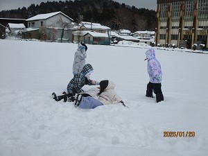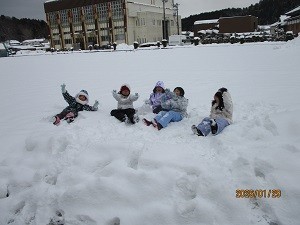 昨日(1/29)の昼休み、グラウンドで雪遊びをしている3年生の子どもたちがいました。上下きちんと雪遊びのできる服装をして、ふわふわの雪のベッドに仰向けに寝転び、ダイナミックに雪遊びを楽しんでいました。雪国ならではのとても微笑ましい光景でした。