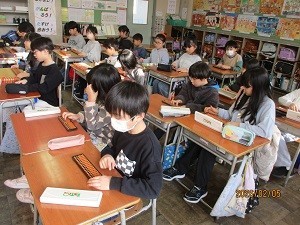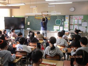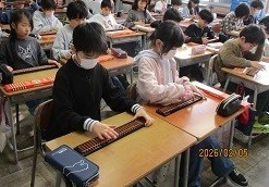 3年生が算数でそろばんの学習をしていました。初めてそろばんに触れる子がほとんどで、今日は、そろばんでの数の読み方や表し方を学習しました。親指と人差し指とでパチパチとそろばんの珠を動かし、数を表す練習をしました。子どもたちは、練習するうちに、そろばんの操作にも慣れてきて、楽しそうに活動していました。