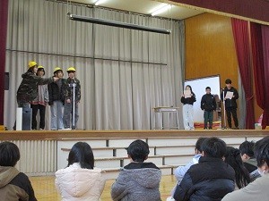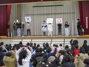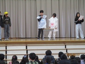 今日は児童朝会があり、給食委員会による「給食○×クイズ」を全校で楽しみました。寸劇を交えてのクイズで、給食委員が扮する1年生や給食の神様も登場し、クイズを盛り上げました。魚を食べると記憶能力や学習能力がアップすることや、調理員さんは野菜を3回洗って給食を調理していることなど、給食のことがよく分かるクイズとなっていました。給食委員会のみなさん、楽しく、ためになるクイズをどうもありがとう!