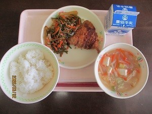 今日の献立は、ごはん、アジフライ、茎わかめのきんぴら、打ち豆のみそ汁、牛乳でした。アジフライは衣がサクサクとしていて、ボリュームもあり、とってもおいしかったです。茎わかめのきんぴらは、コリコリとした茎わかめの食感がおいしかったです。