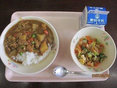 今日の献立は、ボークカレー、福神漬け和え、牛乳でした。子どもたちに大人気のカレー。どの教室でも、おかわりをしている子が大勢いました。福神漬け和えには、チーズも入っており、味のアクセントになっていておいしかったです。今年度の給食は、明日が最終日となります。