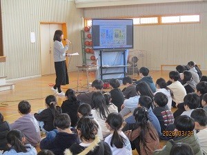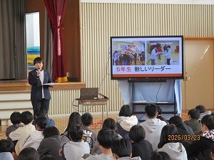 校長講話では、各学年の3学期の頑張りの姿を写真で振り返り、成長したことを子どもたちに伝えていきました。そして、自分の頑張りとみんなの頑張りにみんなで拍手を送り合いました。その他、生活指導担当の先生から、春休みの生活について交通事故やSNS使用の注意に関するお話がありました。最後にスポーツの大会の表彰を行いました。