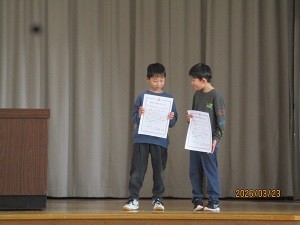 今日は3学期終業式でした。1年生、3年生、5年生の代表児童が、3学期やこの1年間に頑張ったことを発表しました。堂々とした発表で、大変すばらしかったです。