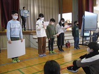 13日(月)の児童朝会では、給食委員会がたてわり班対抗学年別○×クイズを企画しました。給食に関連した〇×クイズをたてわり班の学年ごとに挑戦していきます。上の学年になればなるほど問題の難易度が上がっていきました。正答者が2名の難問もあり、大変盛り上がりました。
