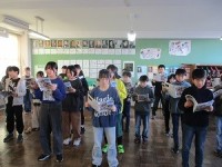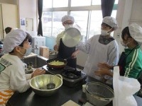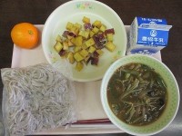 今日の献立は、チキンカレーライス、福神漬け和え、お祝いデザート、牛乳でした。子どもたちに大人気のカレーライス。ほどよい辛さでとってもおいしかったです。お祝いデザートは、いちごクリームのクレープでした。