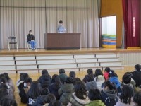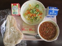 今日の献立は、チキンカレーライス、福神漬け和え、お祝いデザート、牛乳でした。子どもたちに大人気のカレーライス。ほどよい辛さでとってもおいしかったです。お祝いデザートは、いちごクリームのクレープでした。