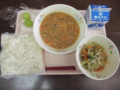今日の献立は、肉みそかけうどん、茎わかめのサラダ、ぶどう、牛乳でした。肉みそか...