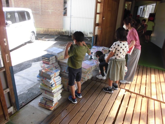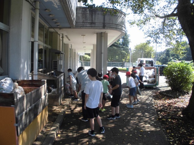 2日(火)の昼休みに、空き缶と古紙の資源回収に業者のトラックが学校に来ることになっていました。お昼の放送で、「資源回収のお手伝いをしてくれる人は、児童玄関に集まって下さい。」と呼び掛けたところ、この暑さにもかかわらず、多くの子どもたちが手伝いに来てくれました。そのお陰で、昼休みの時間を30分残して回収を終えることができました。子どもたちの思い、やる気等すごいです。あちらこちらで笑顔が多く見られました。