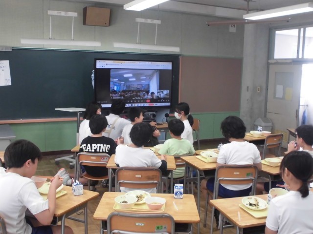 本日の給食に、予定通りに「薬師まいたけとほうれん草 そうのポン酢和え」が提供されました。写真は、給食の時間に4・5年生が加茂小学校の5年生とmeetで交流している場面です。「薬師まいたけとほうれん草 そうのポン酢和え」について、七谷小学校の児童が紹介したり、食べた感想をお互いに伝え合ったりしました。