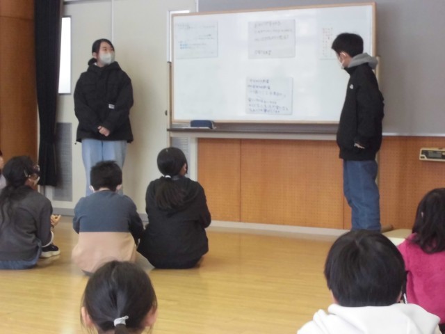 今回の生活朝会は、1~3月の生活目標「目指そう もう一歩の前進 伝えよう ありがとうの心」にかかわって、全校で確認しました。生活目標にかかわることを全校で共有した後、具体的な取組について『みどりの仲間班』で話し合い、それぞれの班の代表がみんなに向かった発表しました。