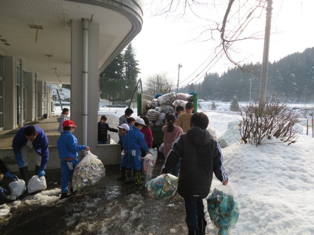 お昼の放送で、資源回収のお手伝いを呼びかけたところ、今回も多くの子どもたちが手伝いに集まってくれました。雪が積もっている中、空き缶や段ボールをみんなで協力しながら、どんどんトラックに積み込みました。やはり、子どもたちの思い、やる気等がすごかったです。あちらこちらで笑顔が多く見られました。