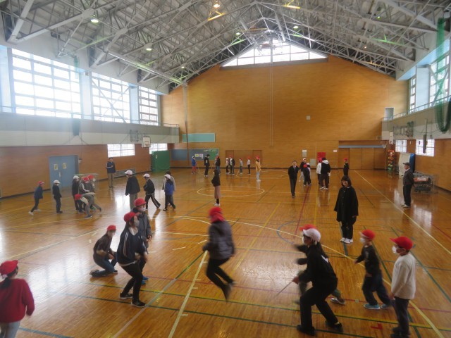 当初の予定では実施日を2月5日(木)としていましたが、欠席を含む体調不良等の児童が多かったため、本日の3限に延期して「大なわ大会」を行いました。これまでに、20分休みを中心に「みどりの仲間」班のメンバー1~6年生で協力して練習を続けてきました。今日、その成果を発揮すべく、各チームともに一生けん命に取り組みました。下級生に声掛けやアドバイス、そして跳ぶ際のポイント等の言葉をかけながら活動する上級生。上級生の動きをよく見、声を聞きながら集中して活動する下級生。すばらしいチームワークを発揮し、それぞれのチームが最高記録目指して取り組みました。みんなで協力して頑張ることができた「大なわ大会」でした。