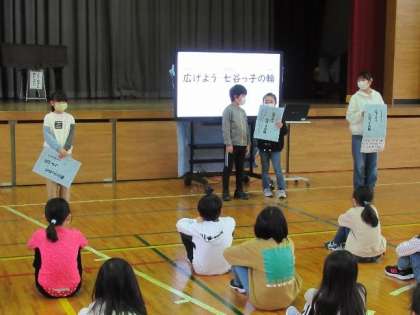 4・5月の生活目標は「広げよう 七谷っ子の輪」です。生活朝会では、学級で話し合っためあてを紹介し合いました。1・2年生のめあては「みんなで仲良く遊ぶ」、3・4年生は「はじめてのことは優しく教えてあげる」、5・6年生は「お手本になるあいさつをしたり、下級生と遊んだりして七谷っ子のよさを伝える」です。自分たちが決めためあてにしっかりと取り組んでほしいです。
