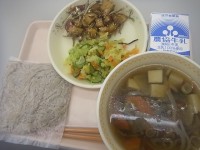2/3(火)節分献立大麦めんけんちんつけ汁大豆と小魚の揚げ煮キャベツの昆布和え牛...