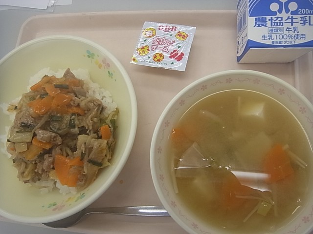 2/4(水)ごはん豆腐とねぎのみそ汁豚キムチ丼の具牛乳型ぬきチーズでした。