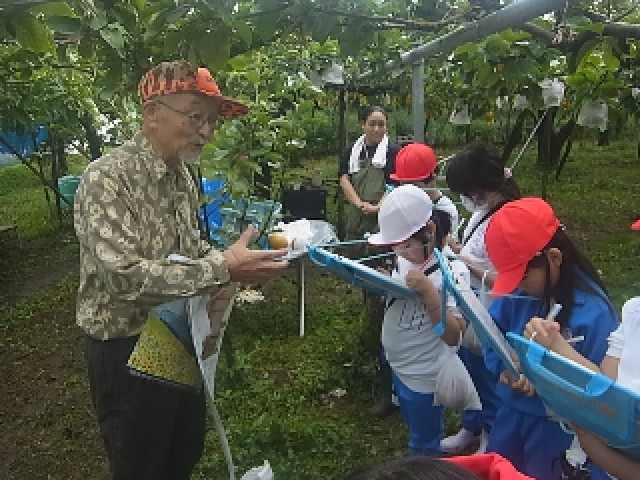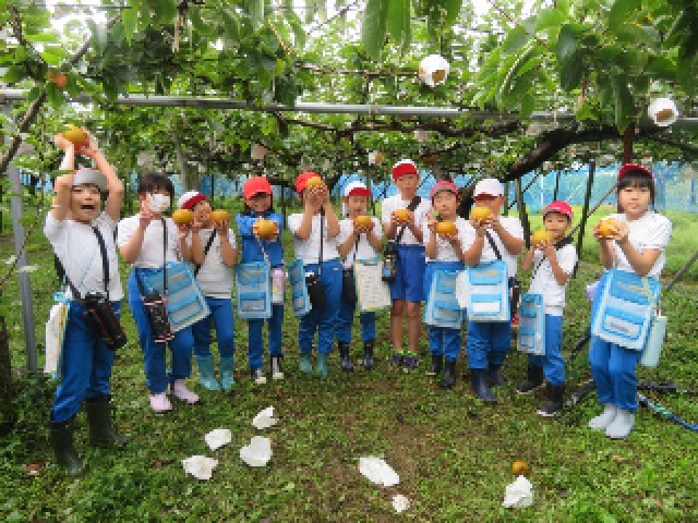 2時間目晴れ間をみて、3年生は学校そばの加茂大橋近くの梨畑へ総合学習として出かけてきました。