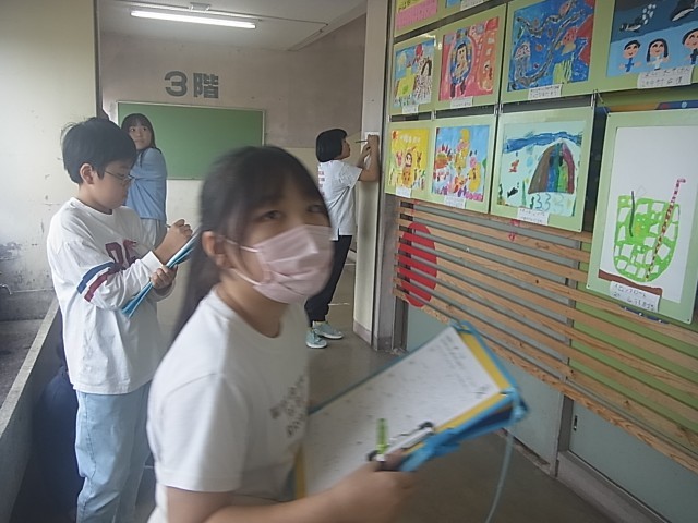 細部までそれぞれの思いの込めて、仕上げられた作品を、全校児童がじっくり鑑賞し、心に残る作品をピックアップし、コメントを記入していました。