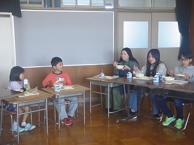 初日は、1年生との交流。給食を一緒に視聴覚室で大きな輪になって食べて、その後、