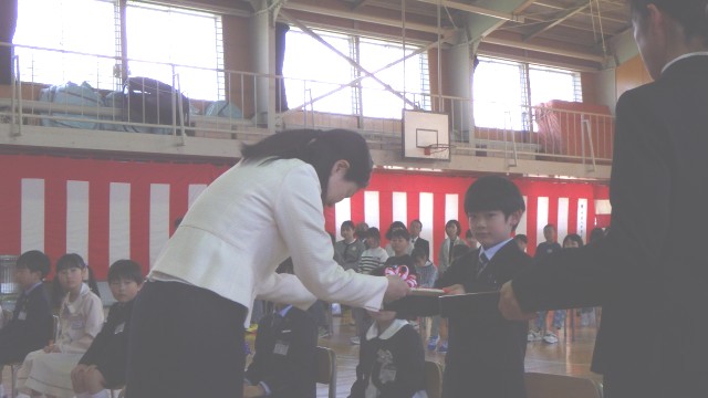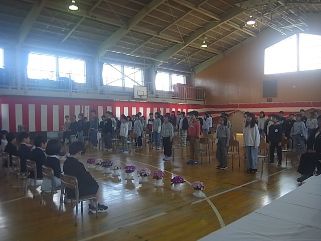 画像は、PTA代表からの記念品贈呈の様子と、「先輩たち」からの歌のプレゼントを聞いているところでした。
