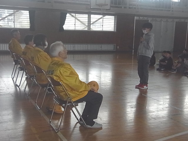 代表の6年生児童があいさつし、「あいさつ会」代表の方からの挨拶を受けました。