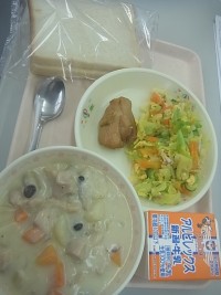 2/19(木)食パンクリームシチュー鶏肉の照り焼きミモザサラダ牛乳でした。