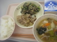 4/13(月)ごはん厚揚げのみそ汁豚肉のスタミナ炒め小松菜とじゃこののり和え牛乳...