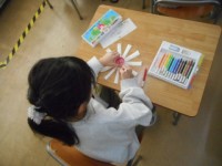 紙コップを開いて、色を塗ったり、キャラクターを描いたりして、自分だけの風車を作り...