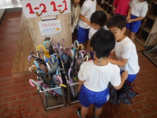 低学年玄関に行くと、1年生が何人か集まっていました。