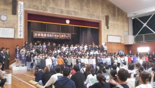 右:全校合唱「もみじ」。子ども、職員だけでなく、来場された方も一緒に歌いました。
