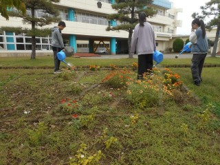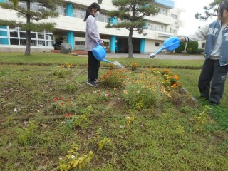 飼育栽培委員会の6年生が校章花壇に水やりをしていました。